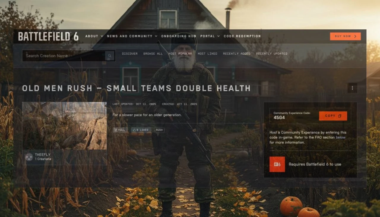 В шутере есть режим Battlefield Portal: с его помощью пользователи создают матчи по собственным условиям. На днях выпустили новинку — сервер Old Men Rush. Это версия для игроков, которые хотят спокойно погонять по локациям: там ниже темп и меньше участников, а у персонажей есть удвоенный запас здоровья и возможность для полной прокачки.