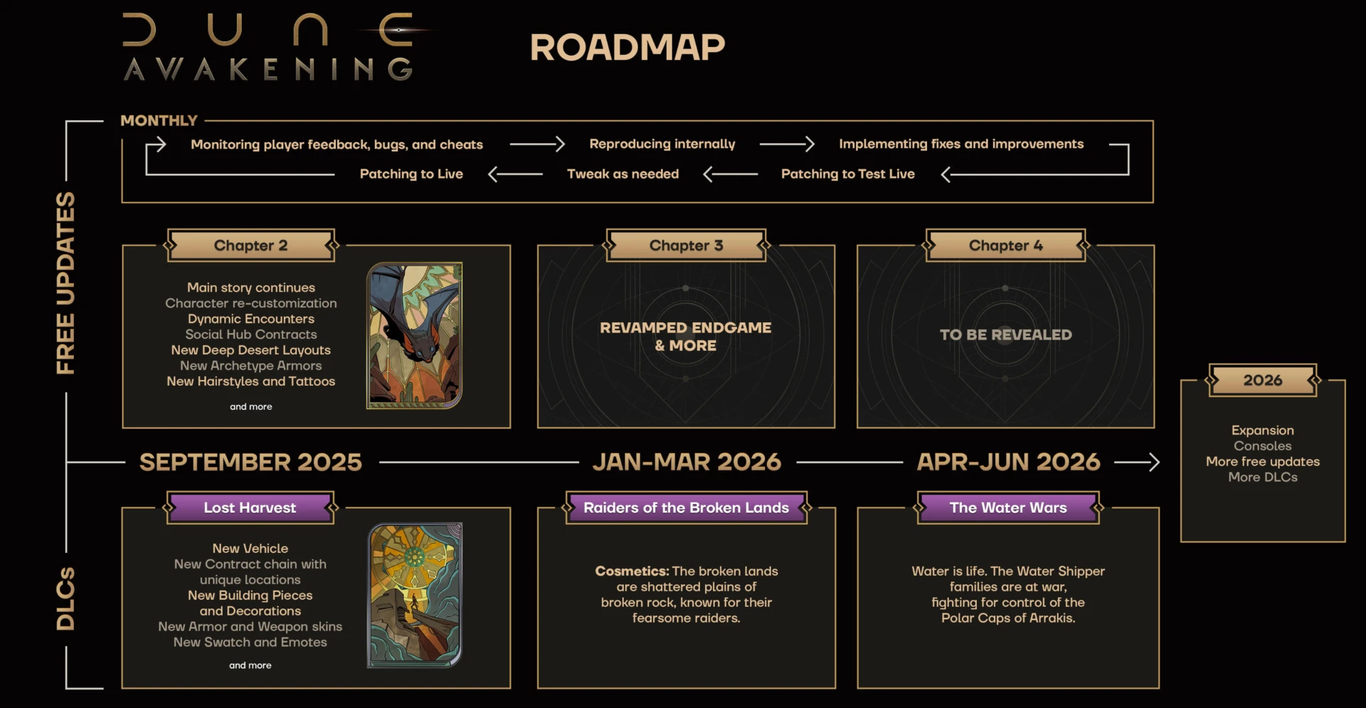 Однако скучать осталось недолго: студия Funcom показала «дорожную карту» будущих обновлений для Dune, и первая крупная волна контента подоспеет уже в сентябре. Разработчики извинились за не слишком активную поддержку и реагирование на жалобы игроков летом, сославшись на то, что после завершения разработки большая часть команды отправилась в отпуск.