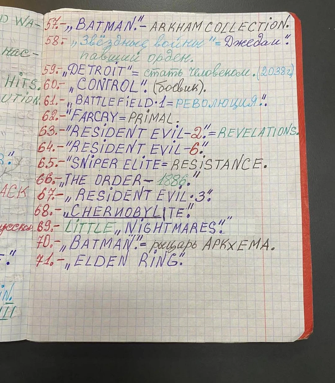 В рукописном каталоге — больше 70 игр. Геймер успел поиграть в ужастики (несколько частей Resident Evil и первая Little Nightmares), а также в боевики (Battlefield и Control). Пока последняя запись в тетрадке — соулслайк Elden Ring. Оценок и рецензий нет.